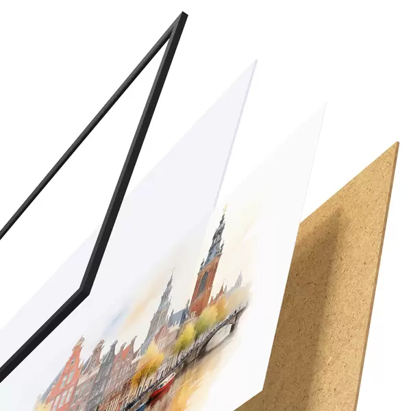 El póster consta de marco, plexiglás, imagen impresa y soporte de aglomerado. El póster puede colgarse inmediatamente en la pared gracias a los soportes de la parte posterior.