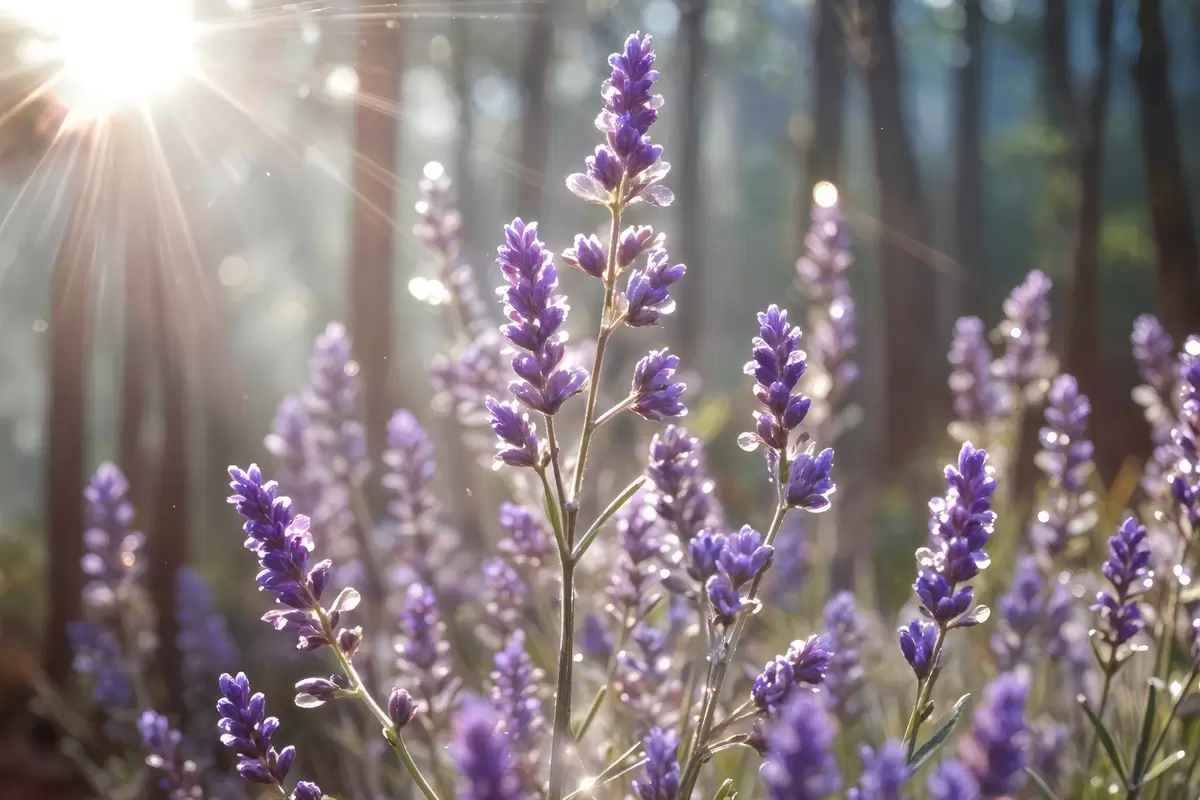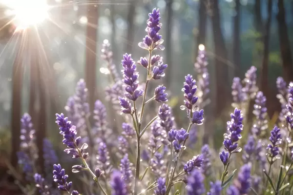 Poster Flores de lavanda violeta en un campo, con un fondo de bosque borroso y luz solar filtrándose a través de ellas. Nr f40570