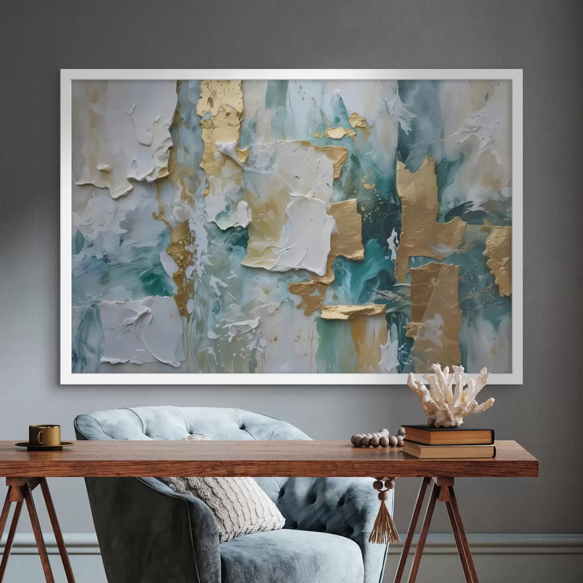 Poster Pintura descascarada con capas de colores blanco, azul y amarillo que crean una impresión abstracta y texturizada. f40577