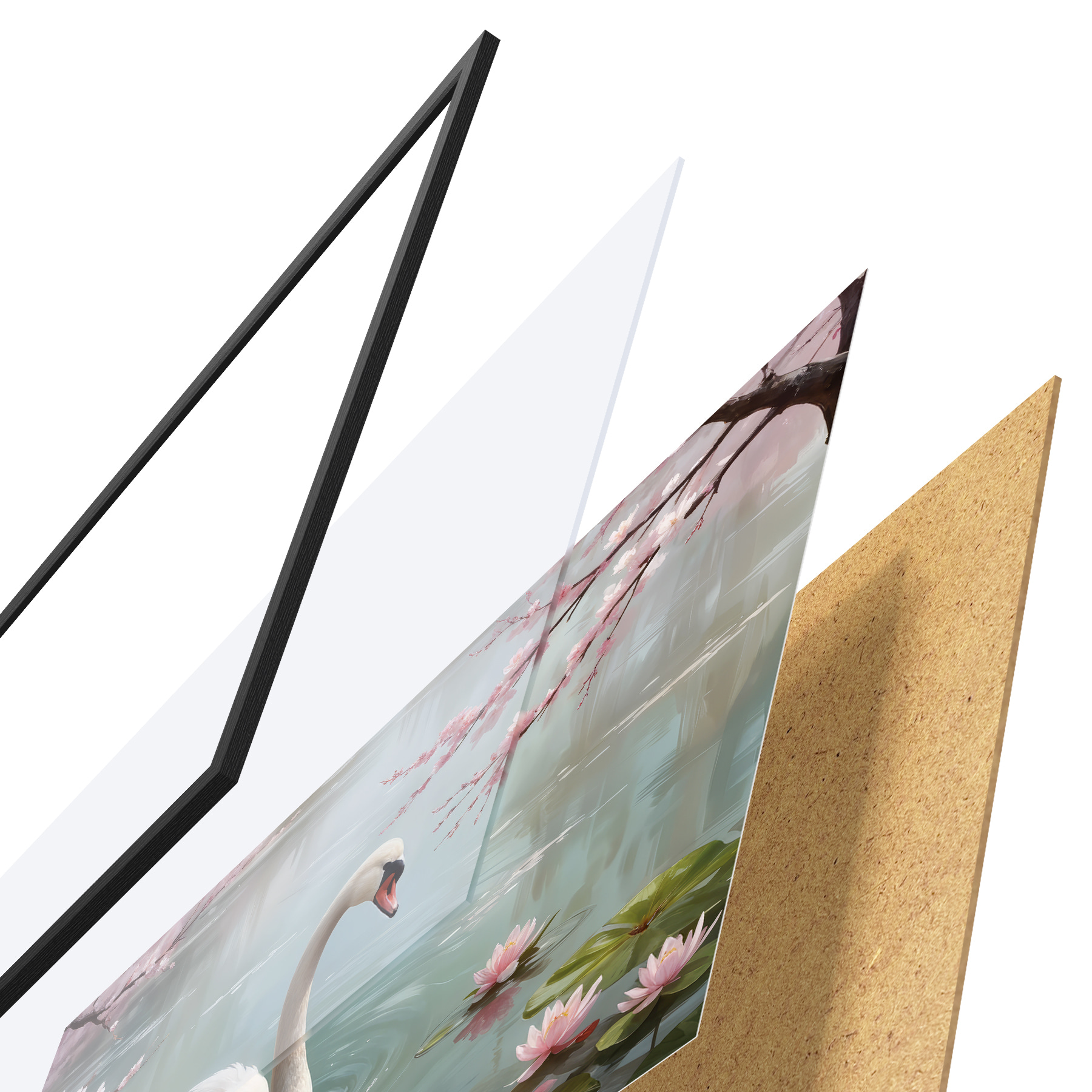 Poster Un elegante cisne blanco nadando en un sereno estanque rodeado de cerezos rosas en flor Nr f40597