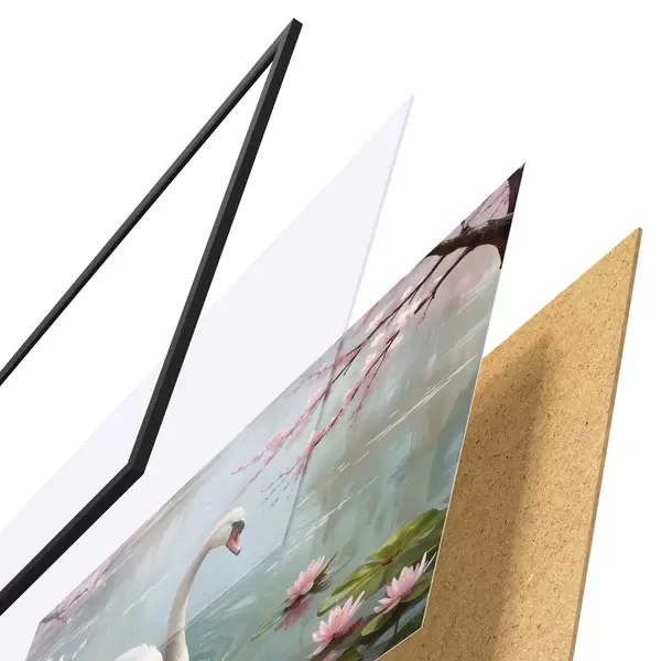 El póster consta de marco, plexiglás, imagen impresa y soporte de aglomerado. El póster puede colgarse inmediatamente en la pared gracias a los soportes de la parte posterior.