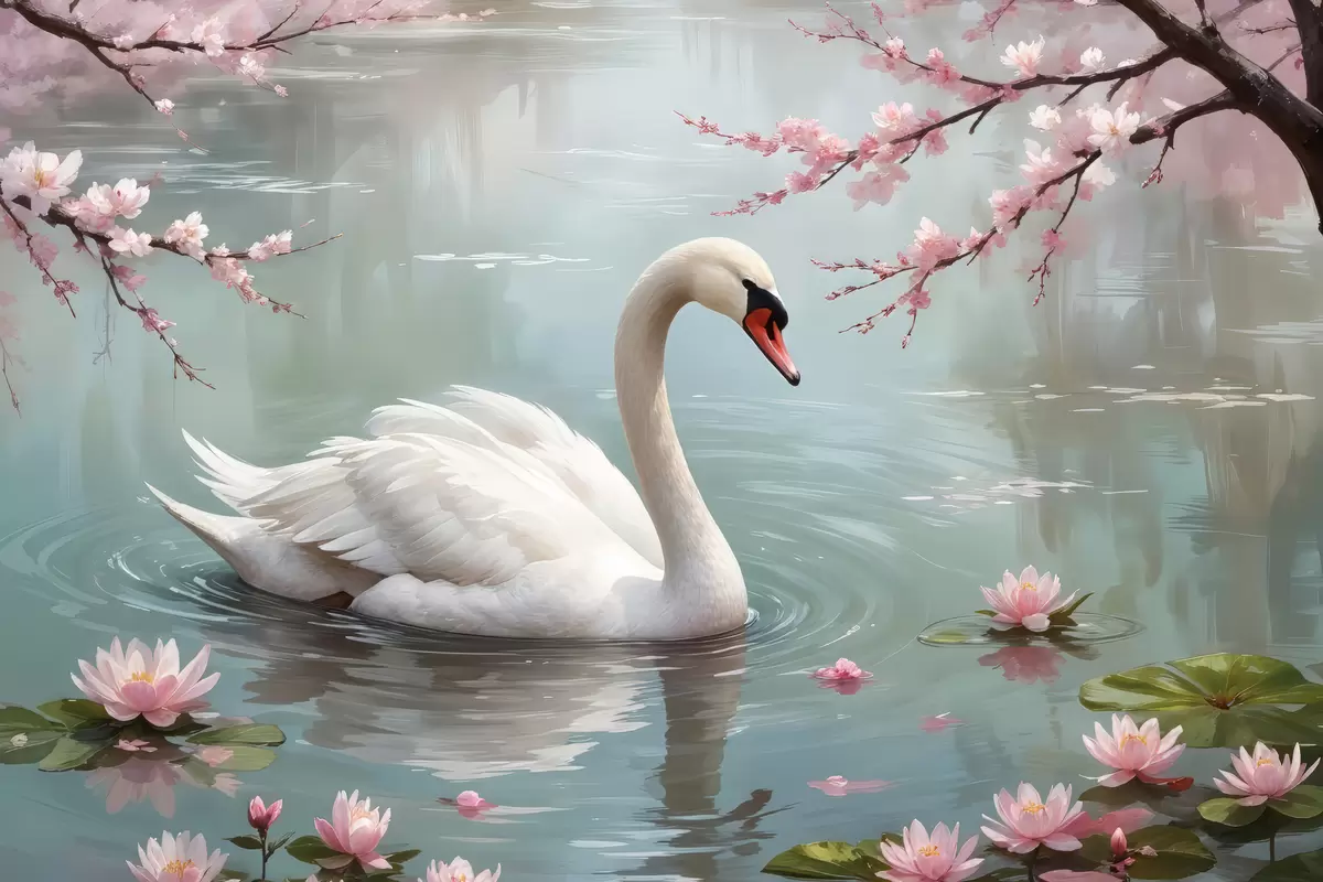 Poster Un elegante cisne blanco nadando en un sereno estanque rodeado de cerezos rosas en flor Nr f40597