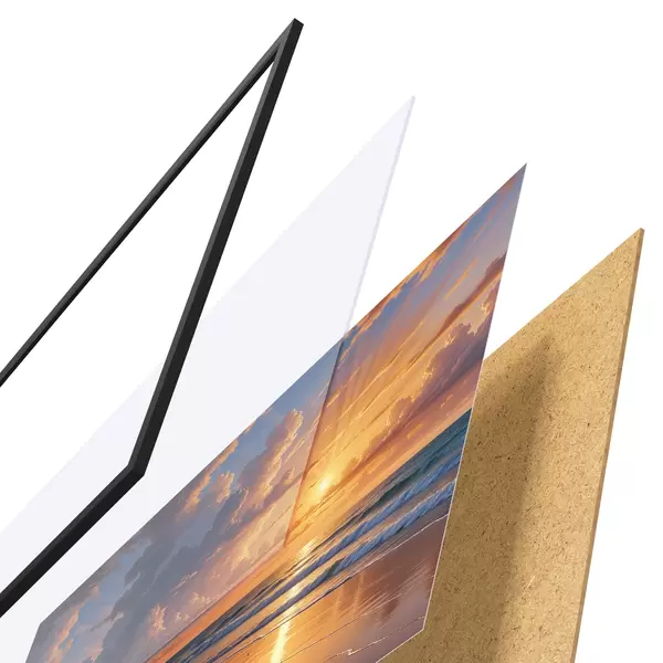 El póster consta de marco, plexiglás, imagen impresa y soporte de aglomerado. El póster puede colgarse inmediatamente en la pared gracias a los soportes de la parte posterior.