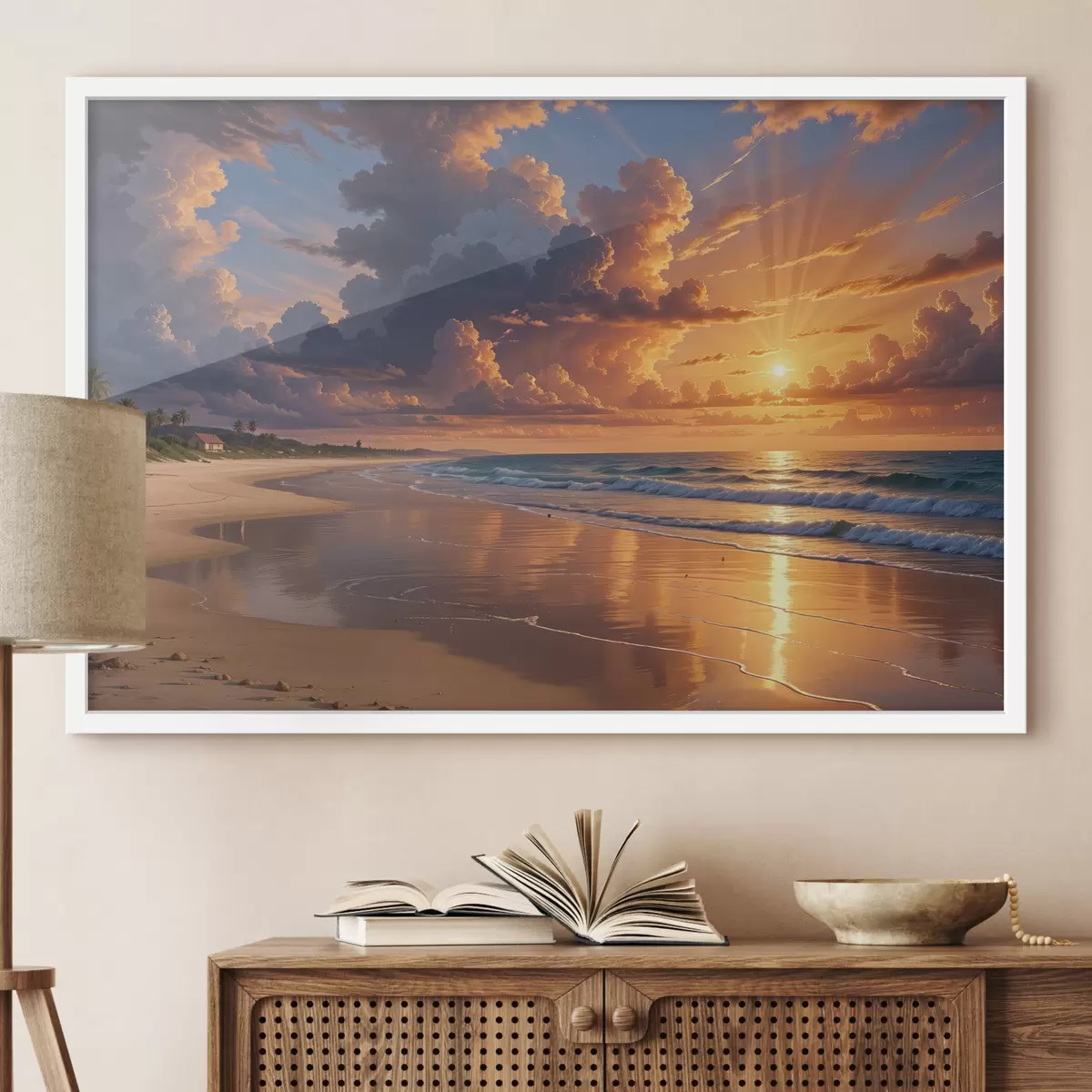 Poster Una dramática puesta de sol sobre una playa tropical, con vibrantes nubes naranjas y rosas reflejadas en las tranquilas aguas f40599