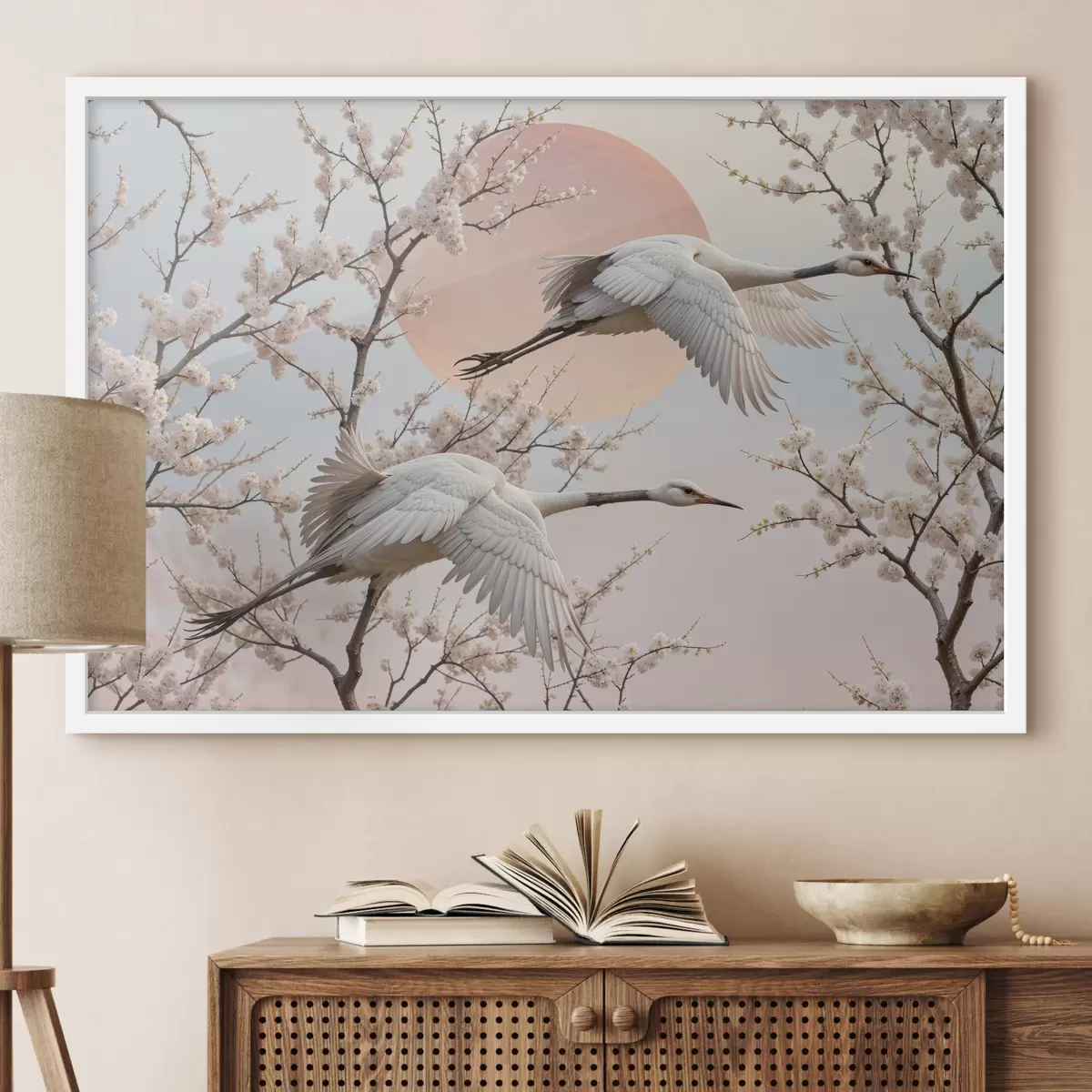 Poster Dos grullas blancas volando entre los cerezos en flor bajo un cielo rosado al atardecer Nr f40601