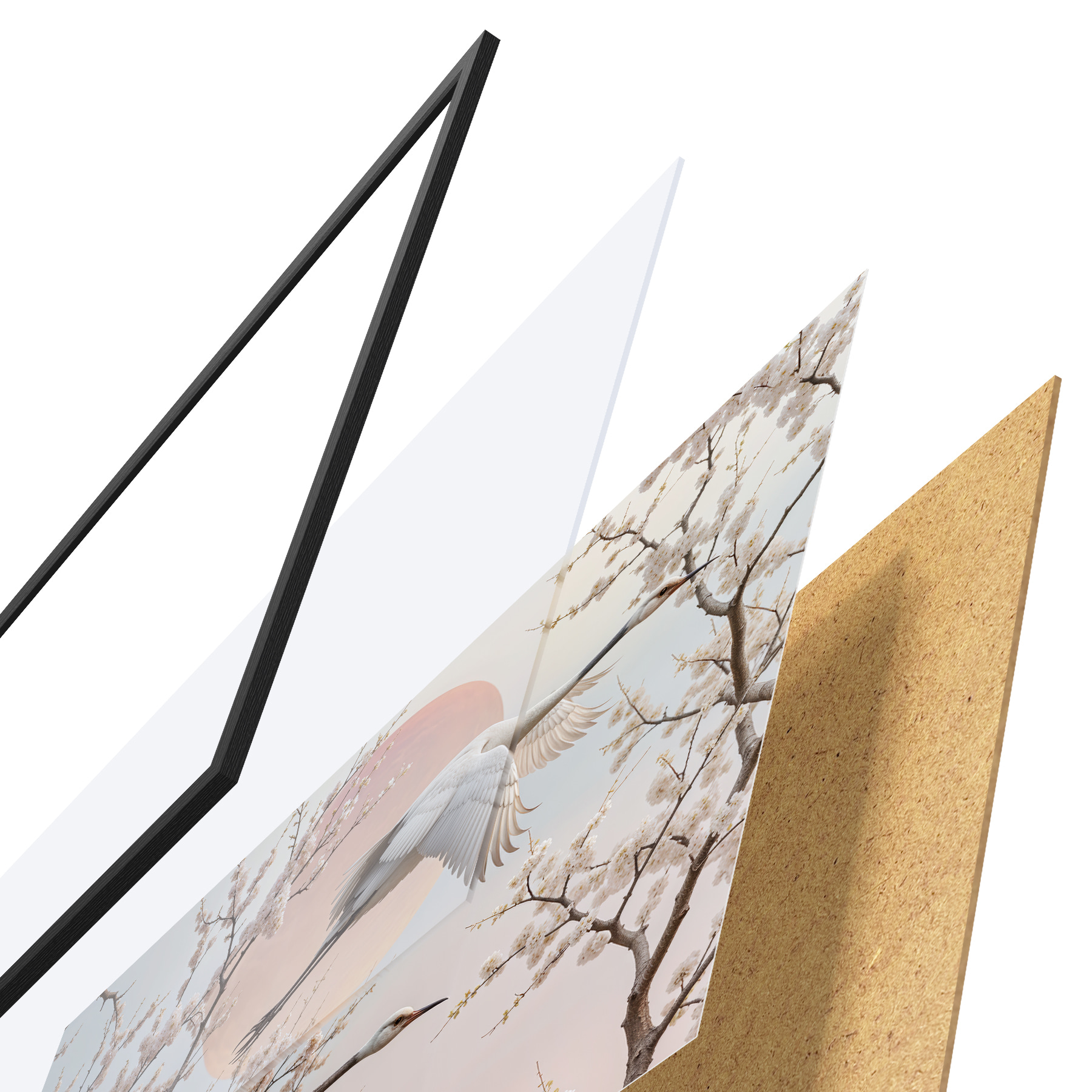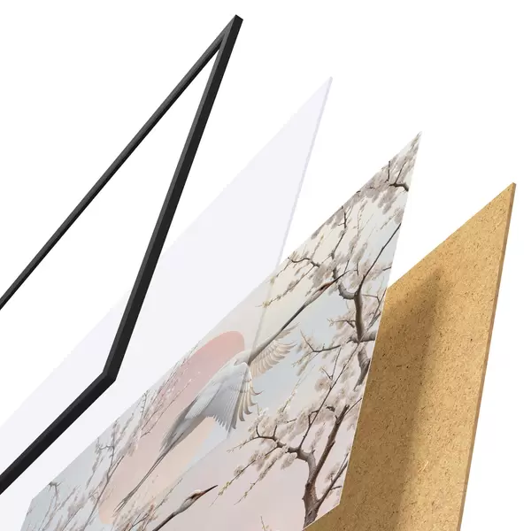 El póster consta de marco, plexiglás, imagen impresa y soporte de aglomerado. El póster puede colgarse inmediatamente en la pared gracias a los soportes de la parte posterior.