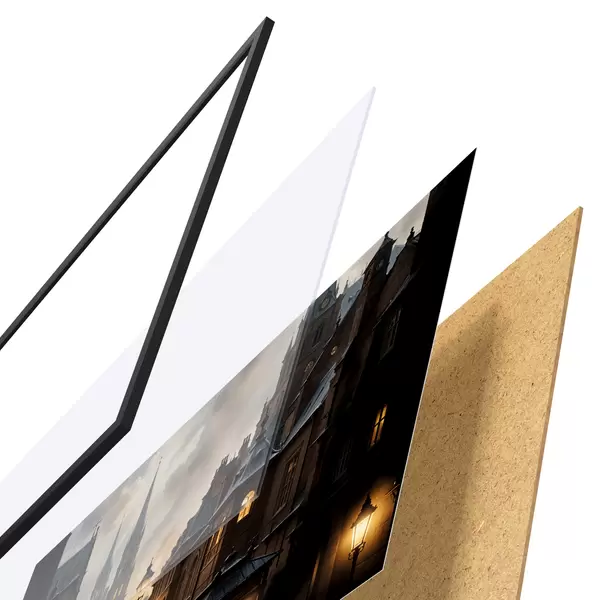 El póster consta de marco, plexiglás, imagen impresa y soporte de aglomerado. El póster puede colgarse inmediatamente en la pared gracias a los soportes de la parte posterior.