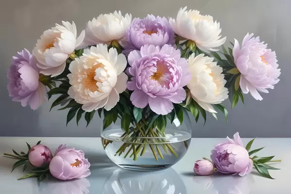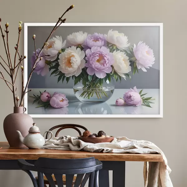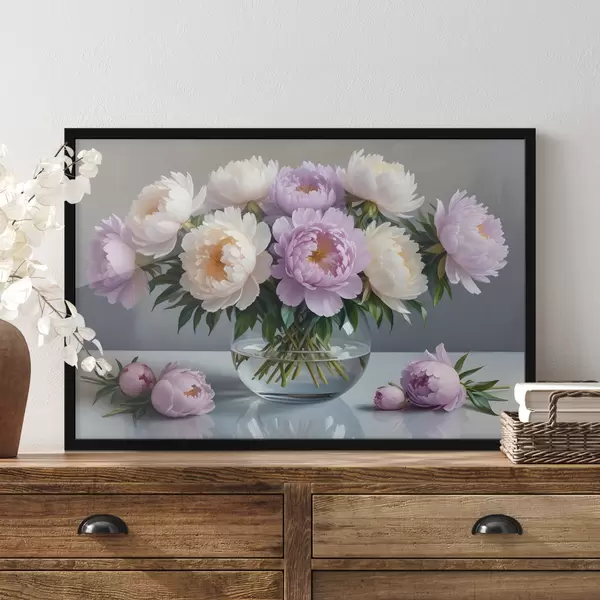 Poster Un ramo de grandes y exuberantes flores de peonía blancas y rosas en un jarrón de cristal sobre fondo gris Nr f40610
