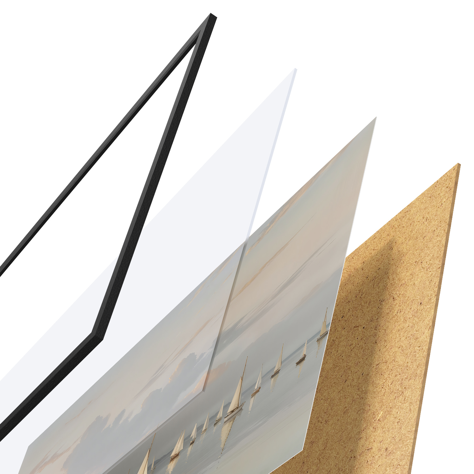 El póster consta de marco, plexiglás, imagen impresa y soporte de aglomerado. El póster puede colgarse inmediatamente en la pared gracias a los soportes de la parte posterior.