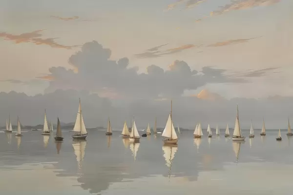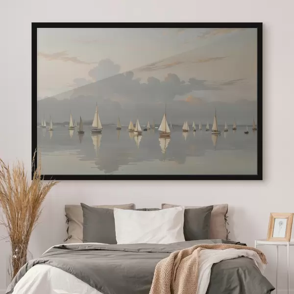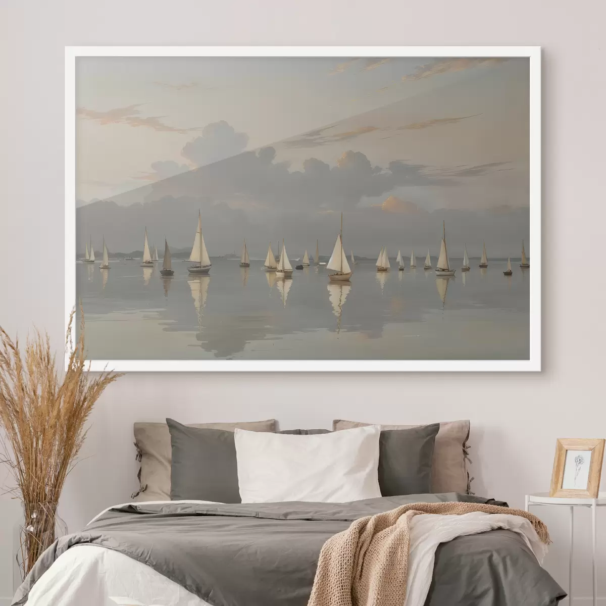 Poster Una flota de veleros blancos en una masa de agua tranquila y reflectante al atardecer, con un cielo nublado de fondo f40615