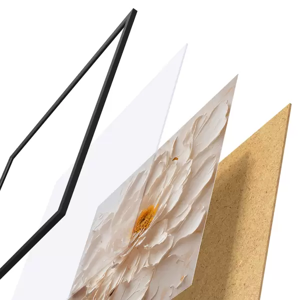 El póster consta de marco, plexiglás, imagen impresa y soporte de aglomerado. El póster puede colgarse inmediatamente en la pared gracias a los soportes de la parte posterior.