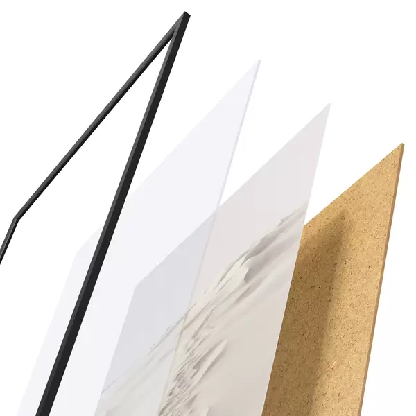 El póster consta de marco, plexiglás, imagen impresa y soporte de aglomerado. El póster puede colgarse inmediatamente en la pared gracias a los soportes de la parte posterior.