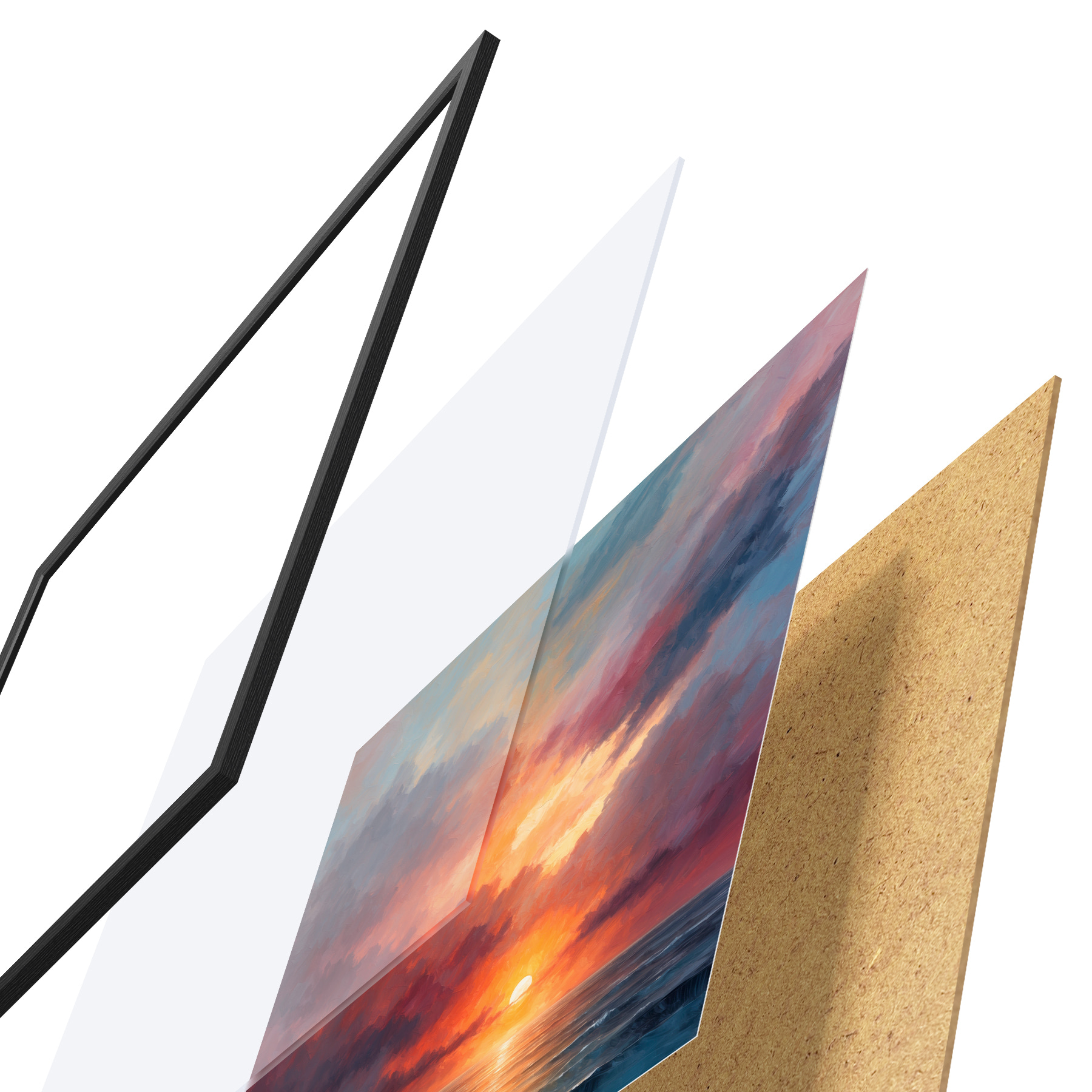 El póster consta de marco, plexiglás, imagen impresa y soporte de aglomerado. El póster puede colgarse inmediatamente en la pared gracias a los soportes de la parte posterior.