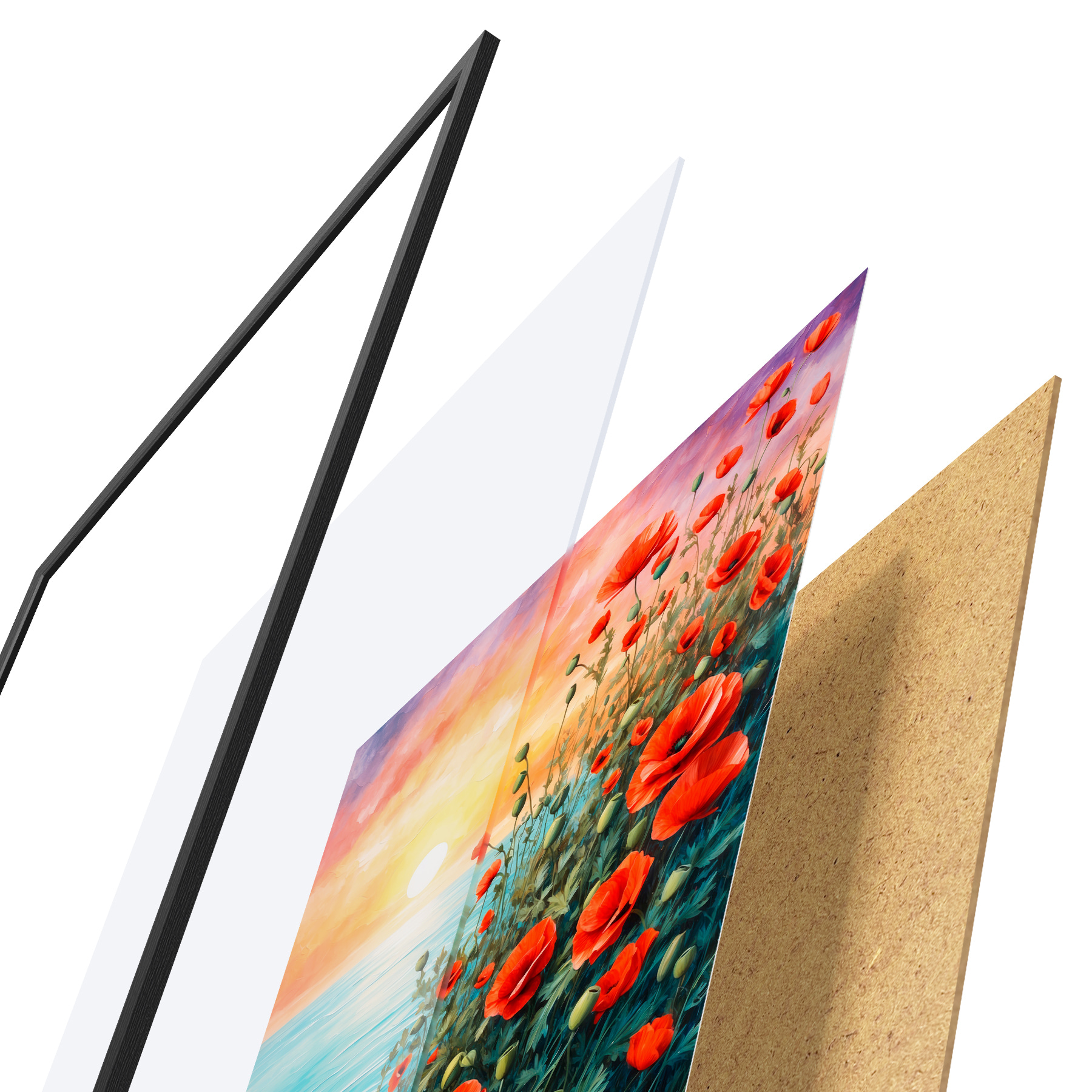El póster consta de marco, plexiglás, imagen impresa y soporte de aglomerado. El póster puede colgarse inmediatamente en la pared gracias a los soportes de la parte posterior.