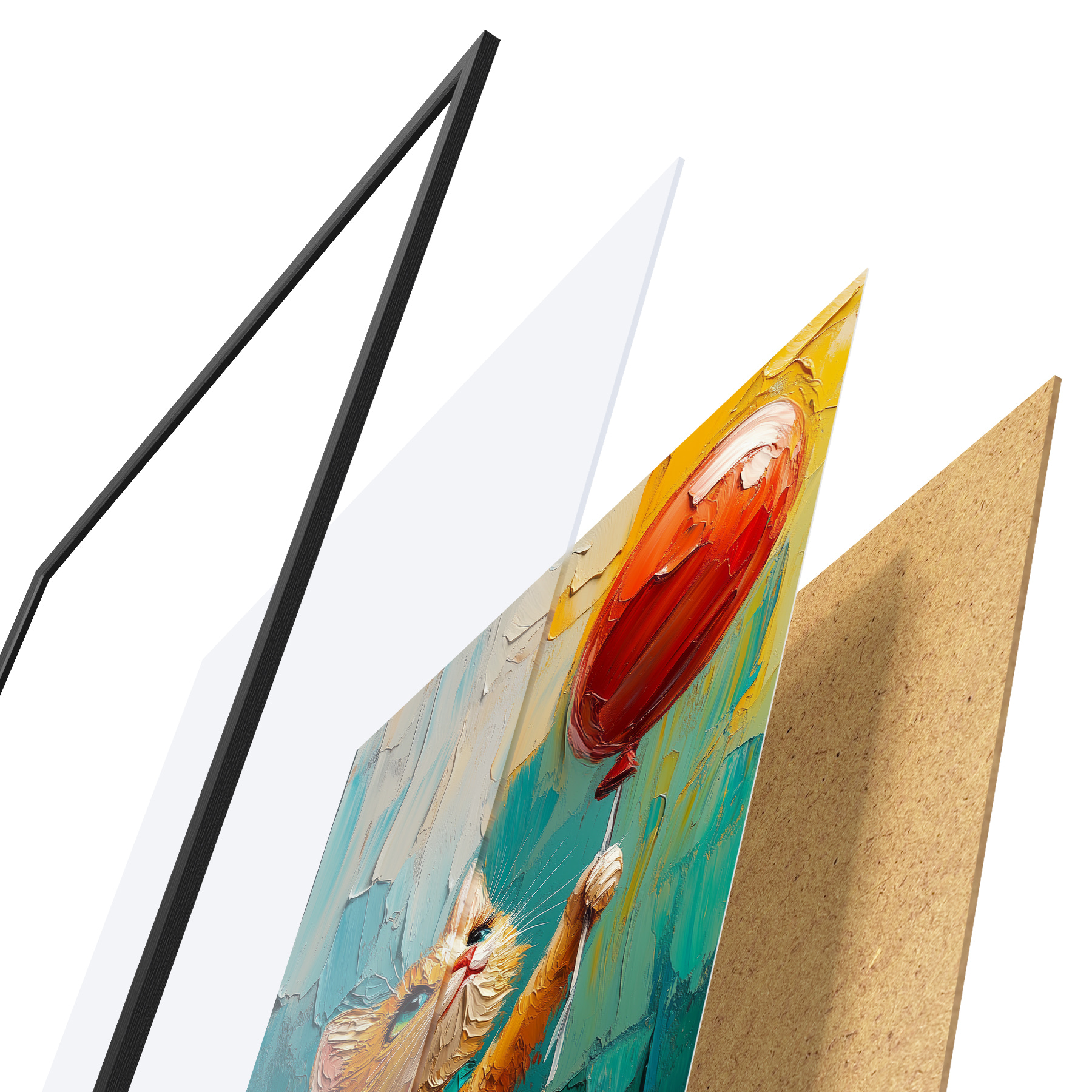 El póster consta de marco, plexiglás, imagen impresa y soporte de aglomerado. El póster puede colgarse inmediatamente en la pared gracias a los soportes de la parte posterior.