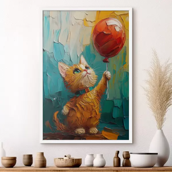 Poster Gato rojo sostiene un globo en sus manos, imitación de una pintura al óleo Nr f40649