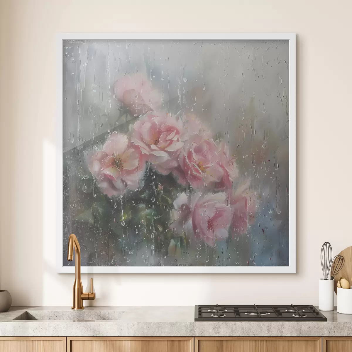 Poster Un ramo de rosas rosas en la ventana cuando llueve Nr f40656