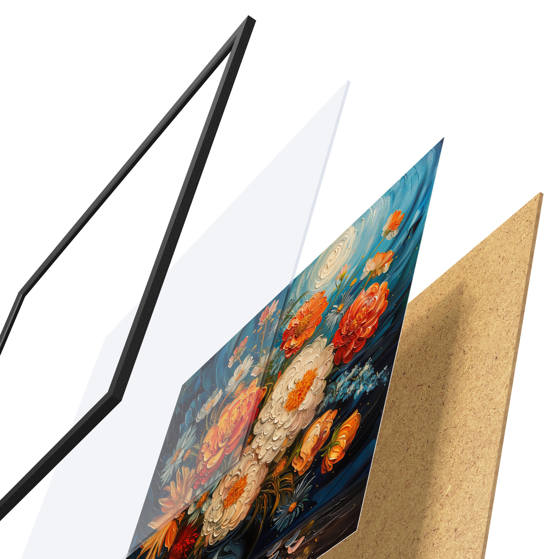 El póster consta de marco, plexiglás, imagen impresa y soporte de aglomerado. El póster puede colgarse inmediatamente en la pared gracias a los soportes de la parte posterior.