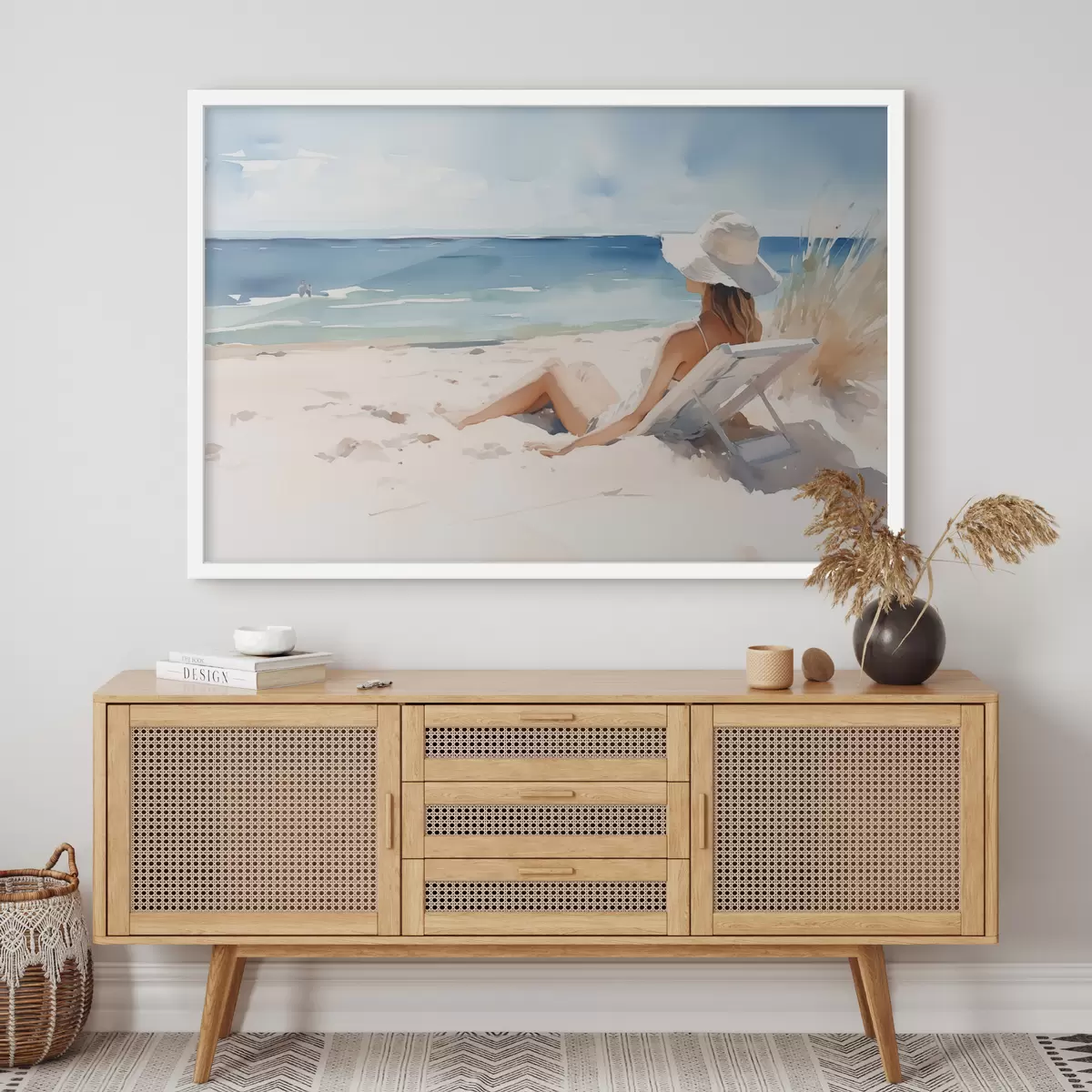Poster Chica relajándose en la playa junto al mar acuarela Nr f40679