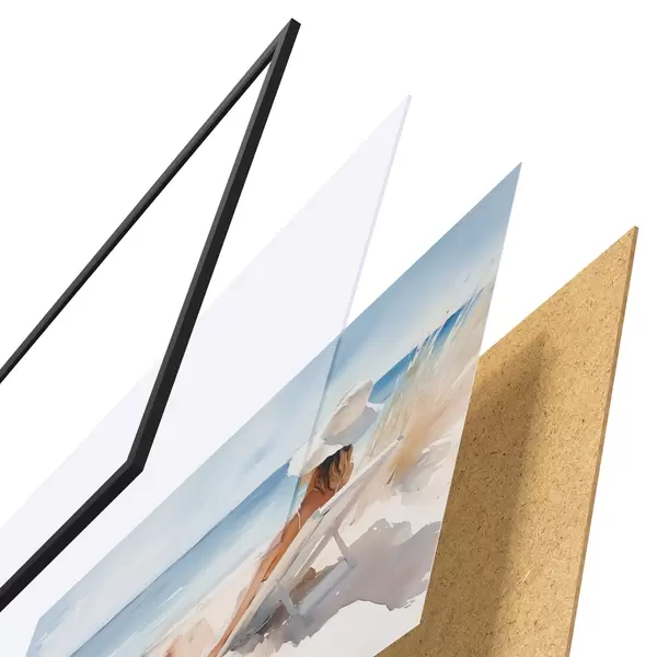 El póster consta de marco, plexiglás, imagen impresa y soporte de aglomerado. El póster puede colgarse inmediatamente en la pared gracias a los soportes de la parte posterior.