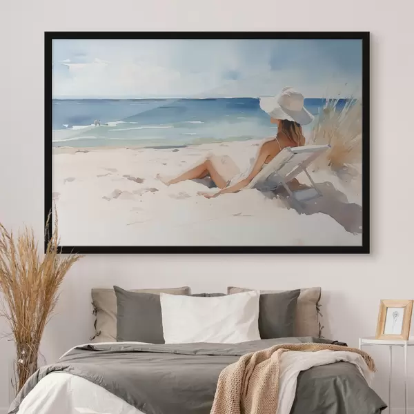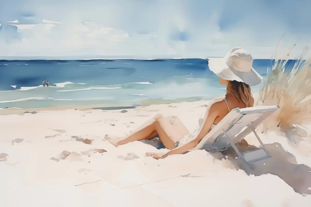 Poster Chica relajándose en la playa junto al mar acuarela Nr f40679