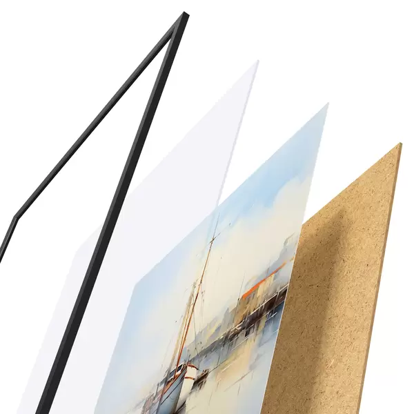 El póster consta de marco, plexiglás, imagen impresa y soporte de aglomerado. El póster puede colgarse inmediatamente en la pared gracias a los soportes de la parte posterior.