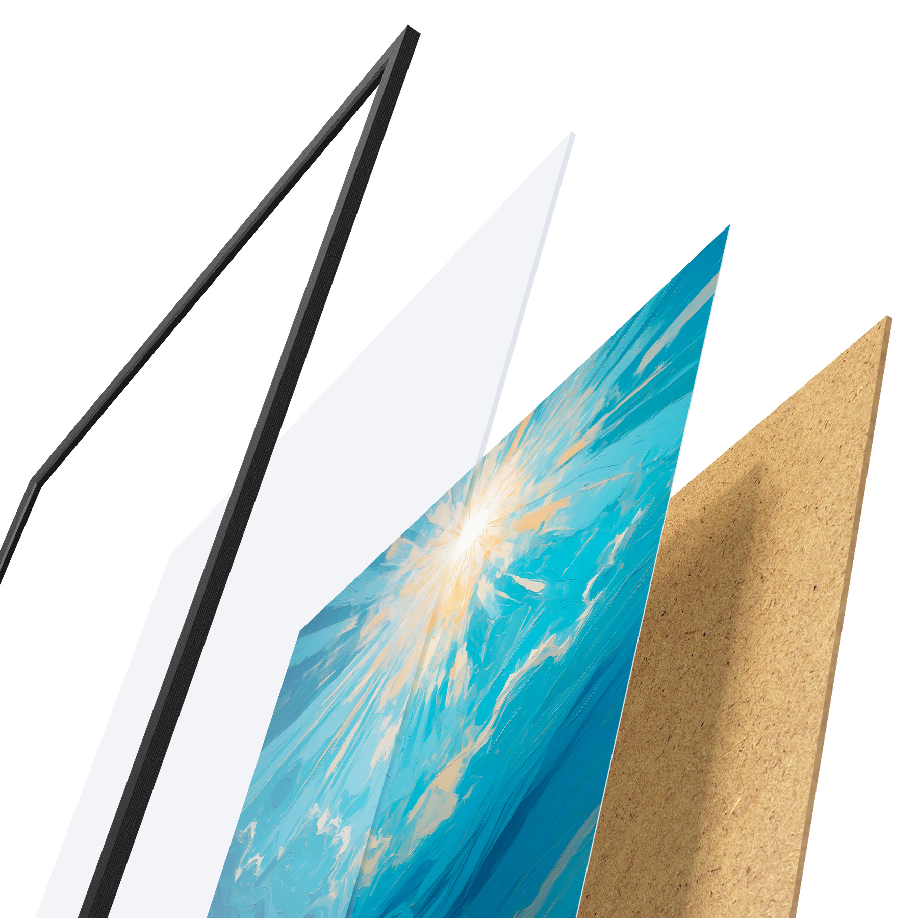 El póster consta de marco, plexiglás, imagen impresa y soporte de aglomerado. El póster puede colgarse inmediatamente en la pared gracias a los soportes de la parte posterior.