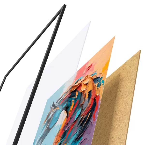 El póster consta de marco, plexiglás, imagen impresa y soporte de aglomerado. El póster puede colgarse inmediatamente en la pared gracias a los soportes de la parte posterior.
