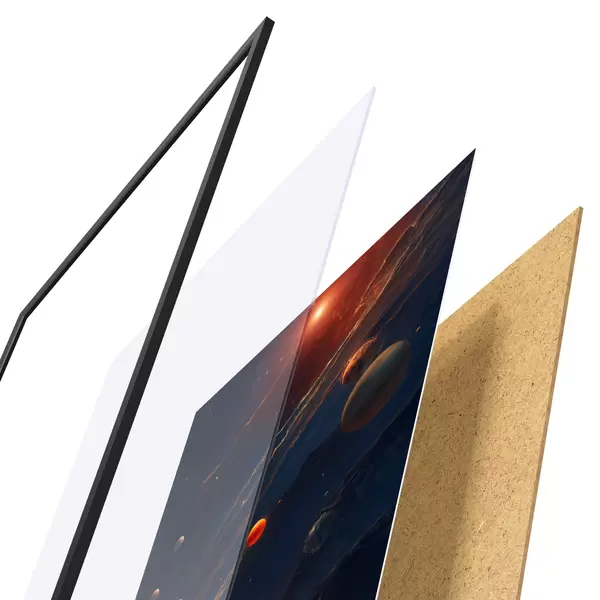 El póster consta de marco, plexiglás, imagen impresa y soporte de aglomerado. El póster puede colgarse inmediatamente en la pared gracias a los soportes de la parte posterior.