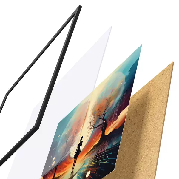 El póster consta de marco, plexiglás, imagen impresa y soporte de aglomerado. El póster puede colgarse inmediatamente en la pared gracias a los soportes de la parte posterior.