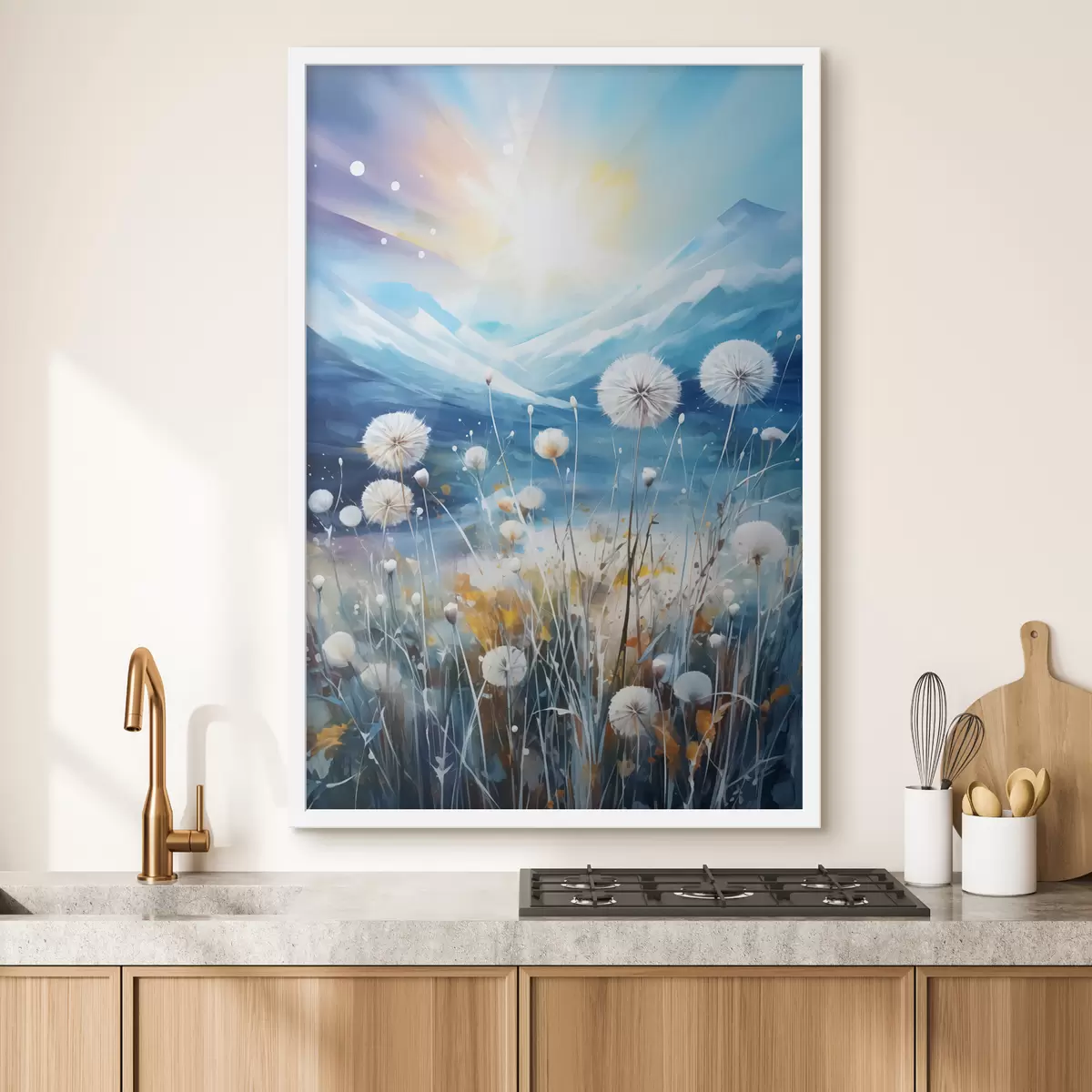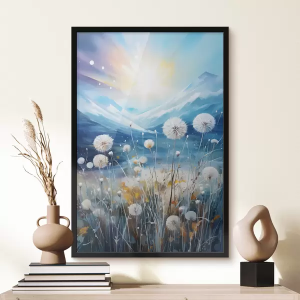 Poster Dientes de león blancos con las montañas azules como telón de fondo Nr f40720