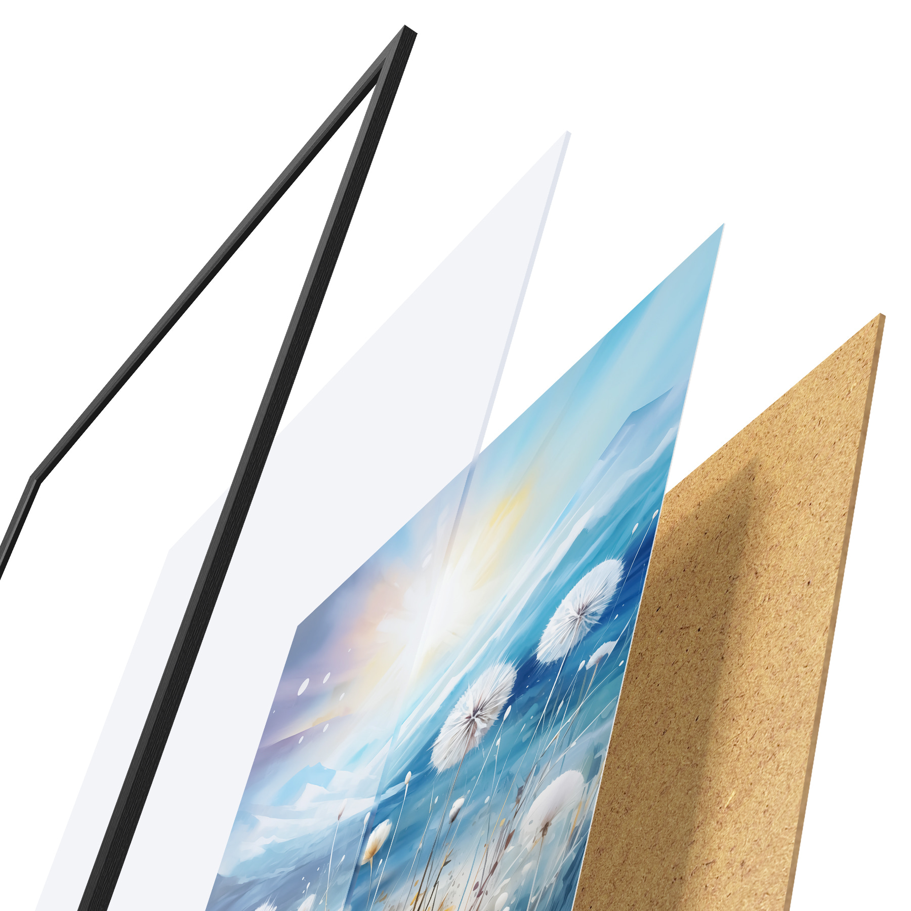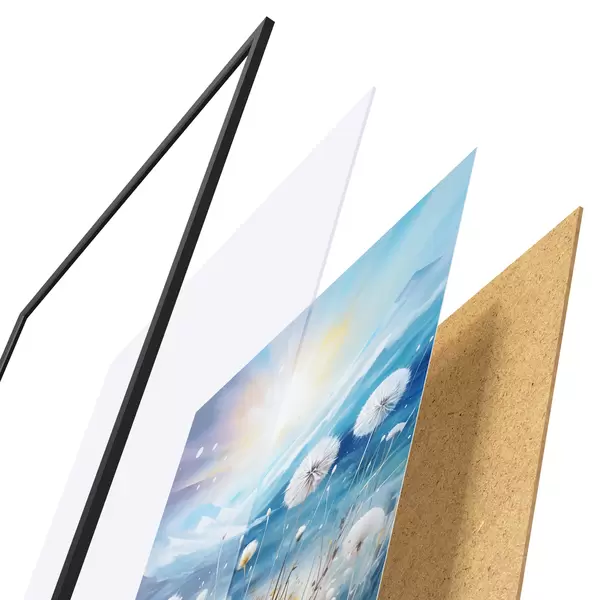 El póster consta de marco, plexiglás, imagen impresa y soporte de aglomerado. El póster puede colgarse inmediatamente en la pared gracias a los soportes de la parte posterior.