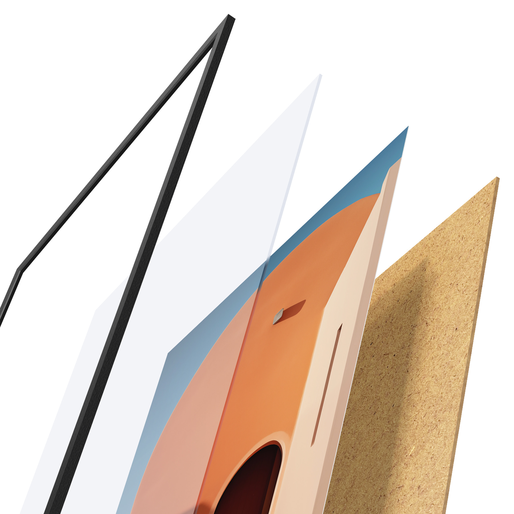 El póster consta de marco, plexiglás, imagen impresa y soporte de aglomerado. El póster puede colgarse inmediatamente en la pared gracias a los soportes de la parte posterior.
