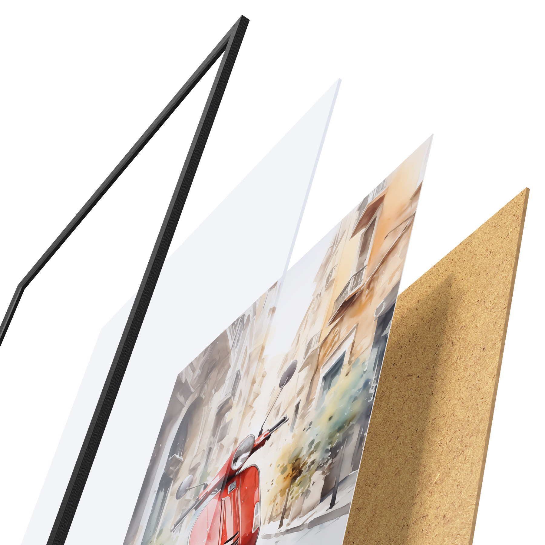 El póster consta de marco, plexiglás, imagen impresa y soporte de aglomerado. El póster puede colgarse inmediatamente en la pared gracias a los soportes de la parte posterior.