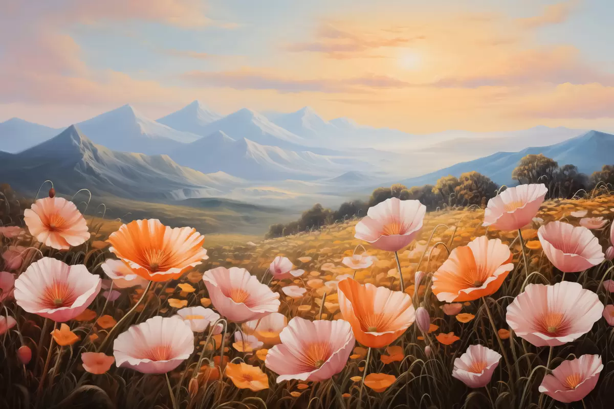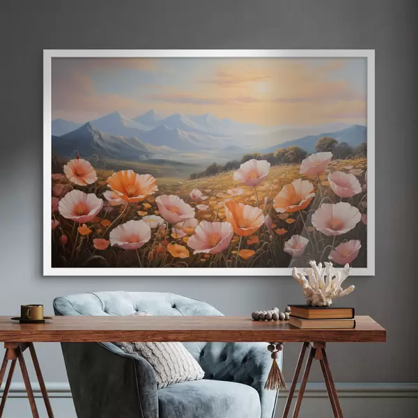 Poster Campo de amapolas al amanecer con montañas al fondo Nr f40730