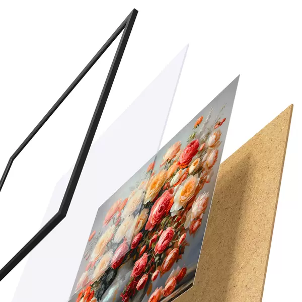 El póster consta de marco, plexiglás, imagen impresa y soporte de aglomerado. El póster puede colgarse inmediatamente en la pared gracias a los soportes de la parte posterior.