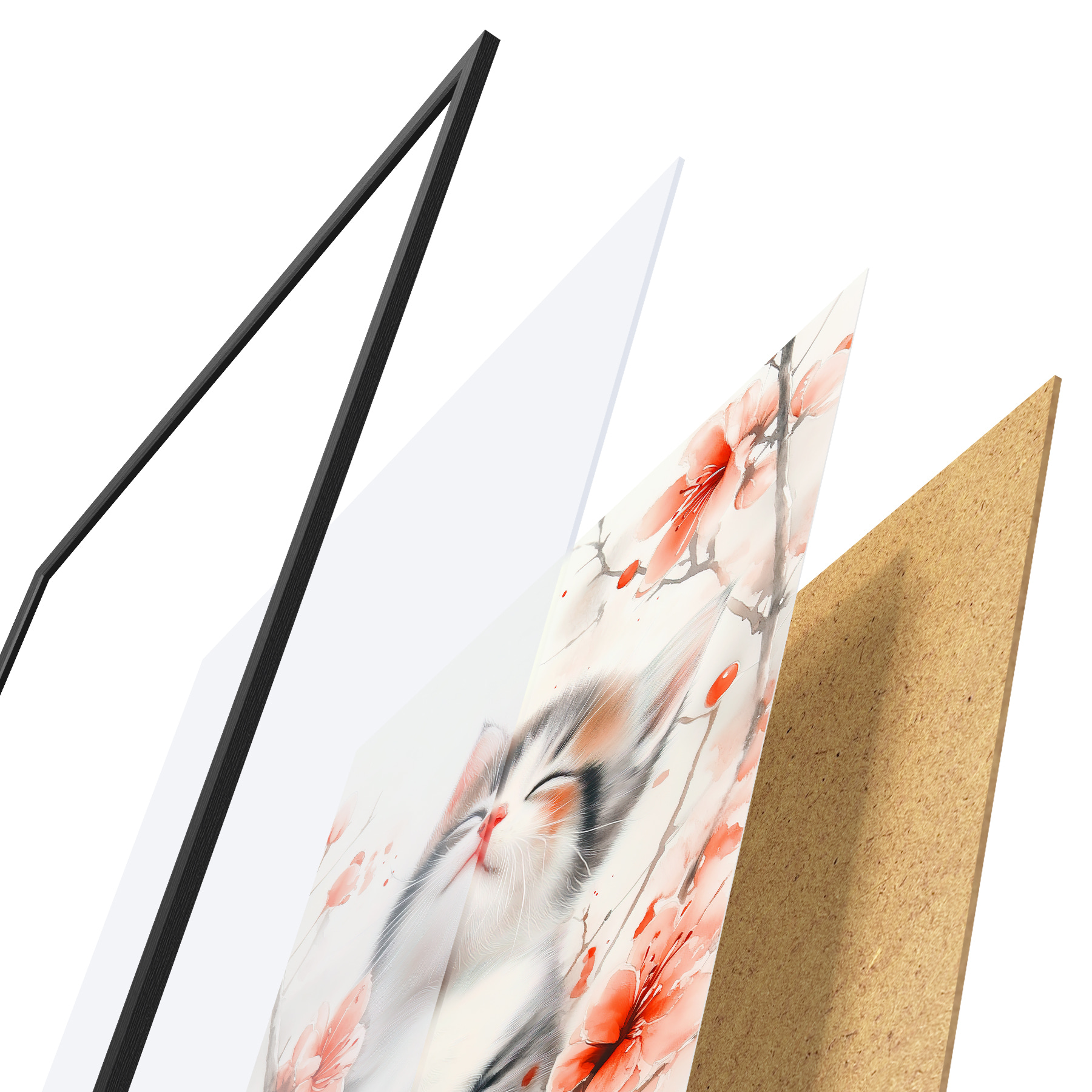 El póster consta de marco, plexiglás, imagen impresa y soporte de aglomerado. El póster puede colgarse inmediatamente en la pared gracias a los soportes de la parte posterior.