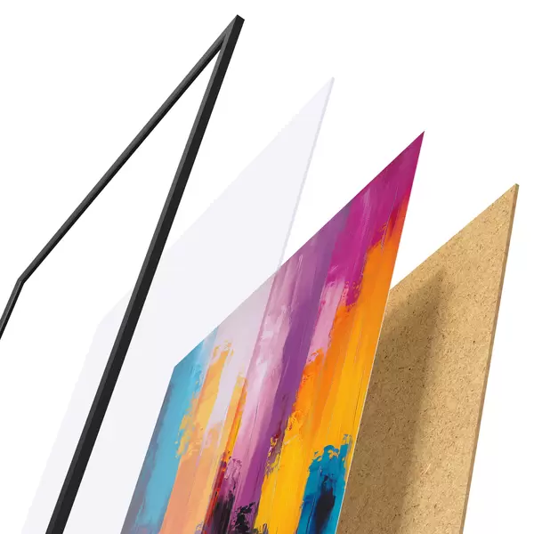El póster consta de marco, plexiglás, imagen impresa y soporte de aglomerado. El póster puede colgarse inmediatamente en la pared gracias a los soportes de la parte posterior.