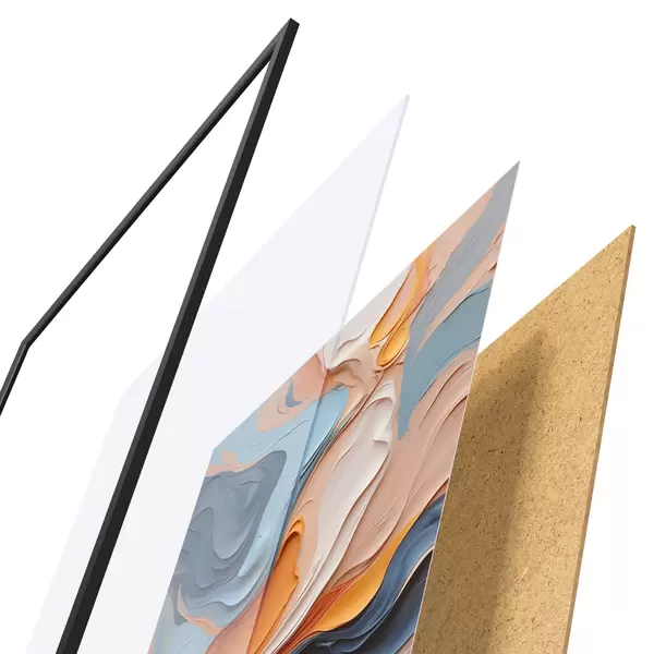 El póster consta de marco, plexiglás, imagen impresa y soporte de aglomerado. El póster puede colgarse inmediatamente en la pared gracias a los soportes de la parte posterior.