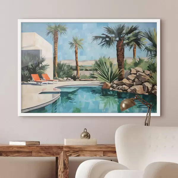 Poster Palmeras cerca del hotel con una piscina cerca de las rocas, de color azul, verde, rojo Nr f40748
