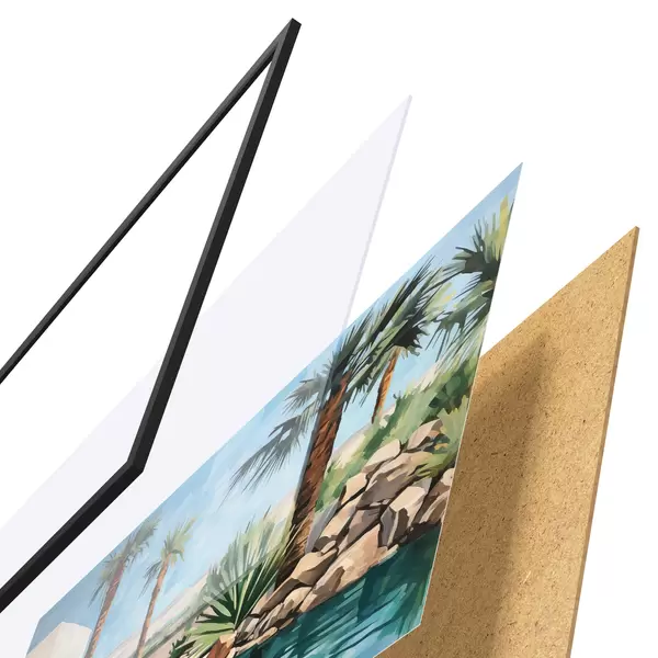 El póster consta de marco, plexiglás, imagen impresa y soporte de aglomerado. El póster puede colgarse inmediatamente en la pared gracias a los soportes de la parte posterior.