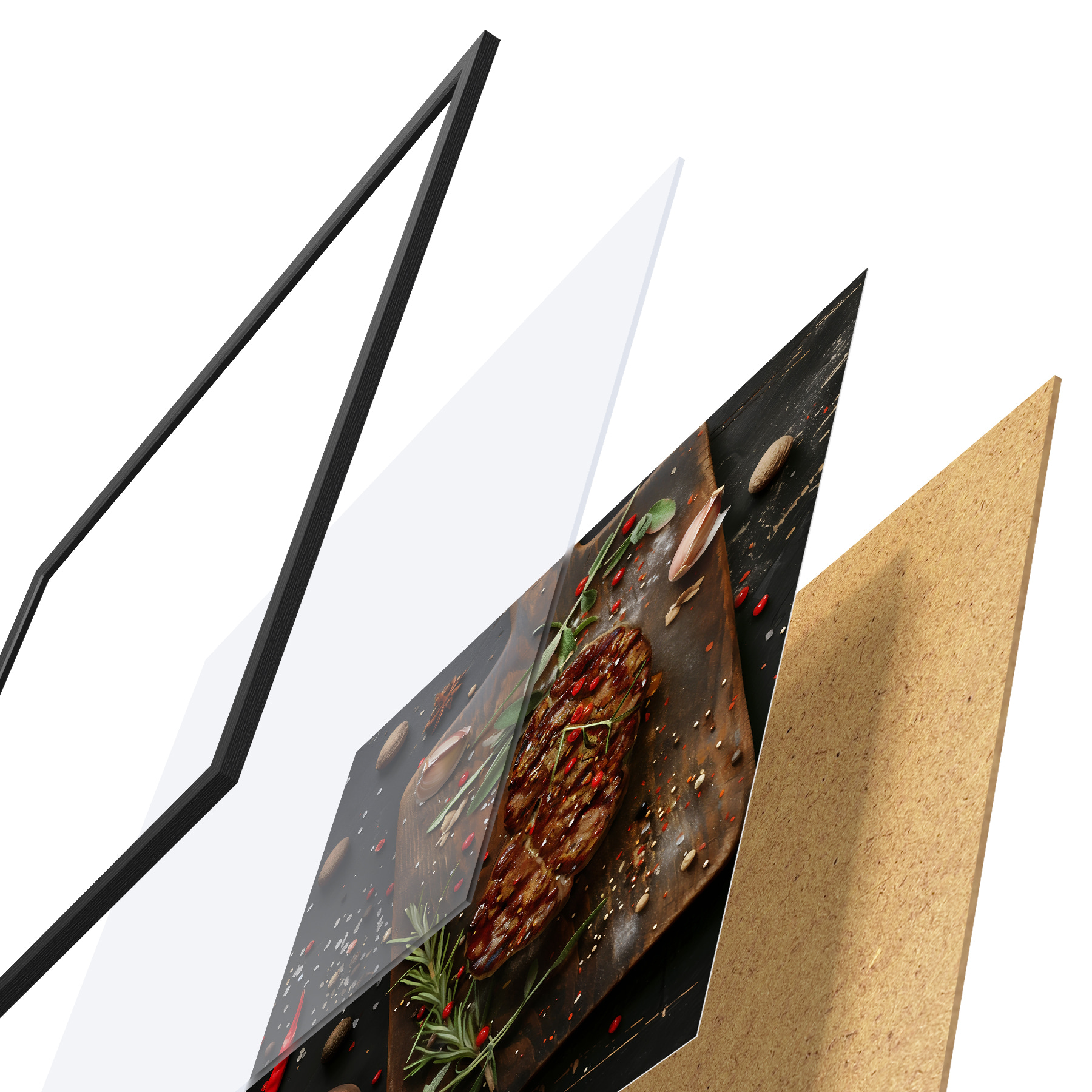 El póster consta de marco, plexiglás, imagen impresa y soporte de aglomerado. El póster puede colgarse inmediatamente en la pared gracias a los soportes de la parte posterior.