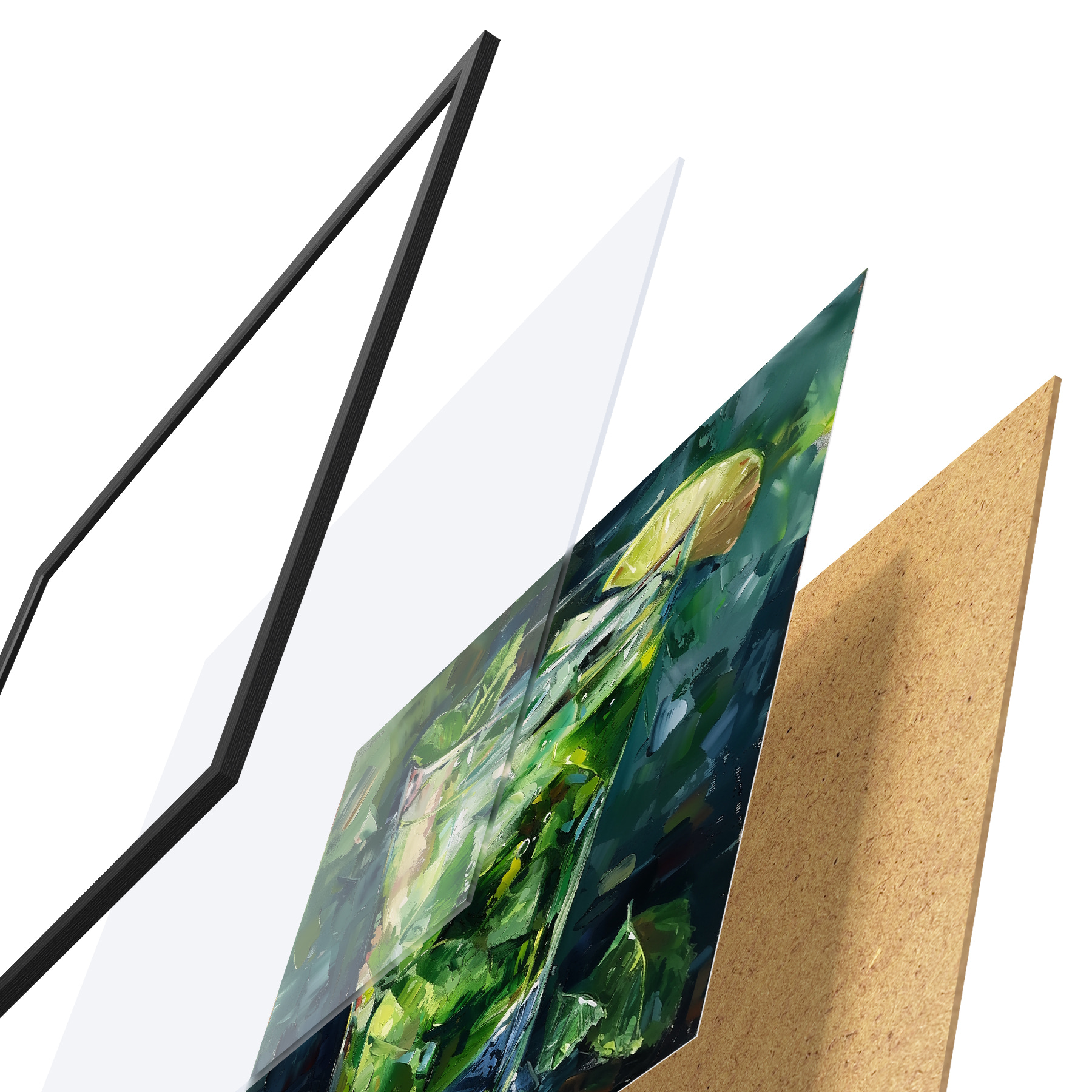 El póster consta de marco, plexiglás, imagen impresa y soporte de aglomerado. El póster puede colgarse inmediatamente en la pared gracias a los soportes de la parte posterior.