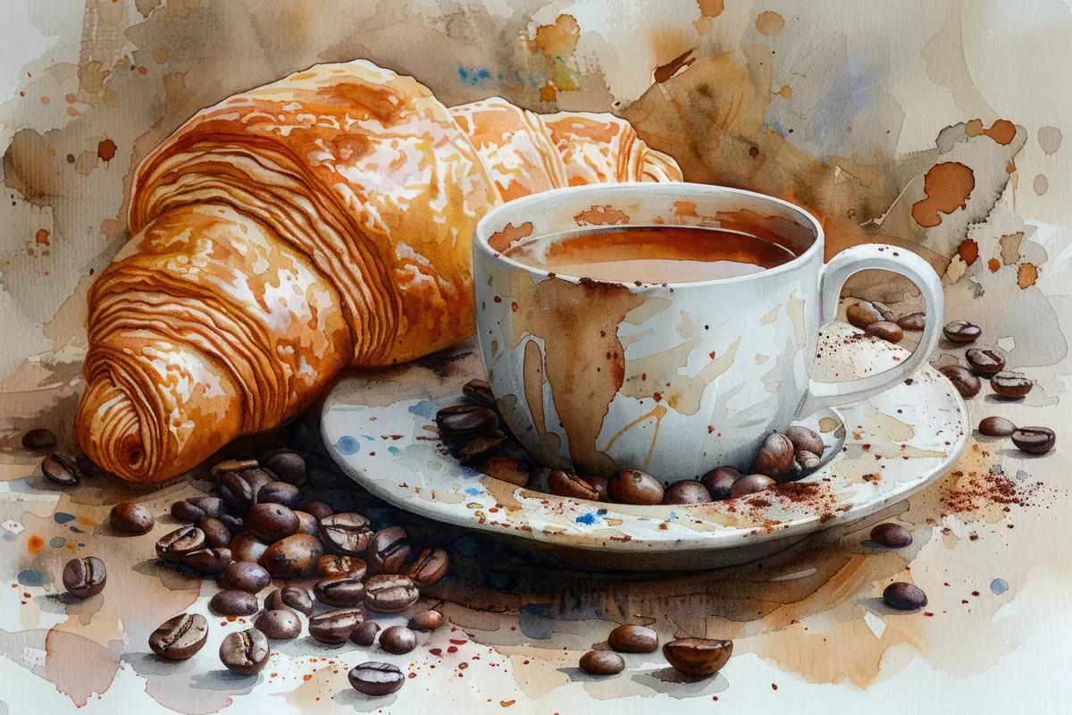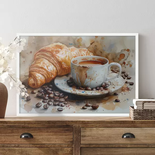 Poster Croissant, mañana, croissant y taza de café, acuarela Nr f40782