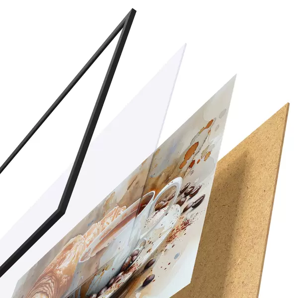 El póster consta de marco, plexiglás, imagen impresa y soporte de aglomerado. El póster puede colgarse inmediatamente en la pared gracias a los soportes de la parte posterior.