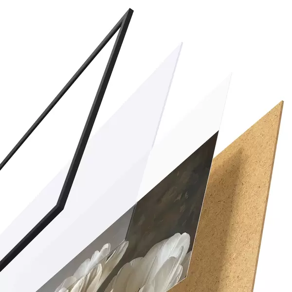 El póster consta de marco, plexiglás, imagen impresa y soporte de aglomerado. El póster puede colgarse inmediatamente en la pared gracias a los soportes de la parte posterior.