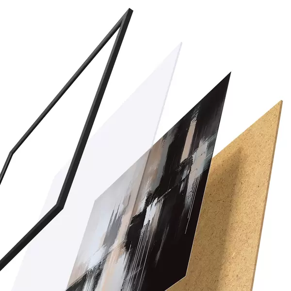 El póster consta de marco, plexiglás, imagen impresa y soporte de aglomerado. El póster puede colgarse inmediatamente en la pared gracias a los soportes de la parte posterior.