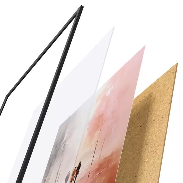 El póster consta de marco, plexiglás, imagen impresa y soporte de aglomerado. El póster puede colgarse inmediatamente en la pared gracias a los soportes de la parte posterior.
