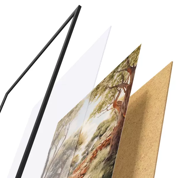 El póster consta de marco, plexiglás, imagen impresa y soporte de aglomerado. El póster puede colgarse inmediatamente en la pared gracias a los soportes de la parte posterior.