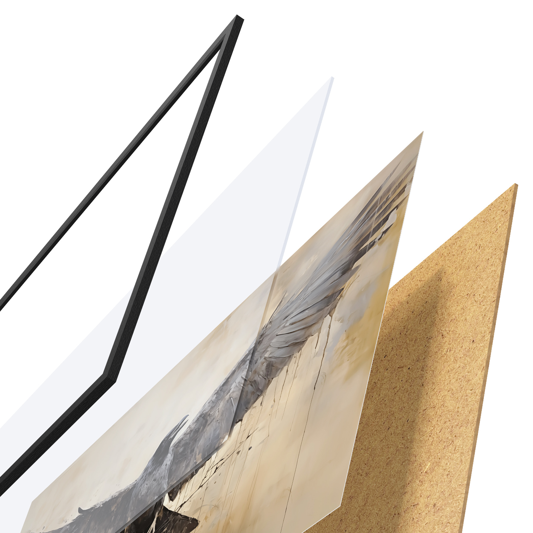 El póster consta de marco, plexiglás, imagen impresa y soporte de aglomerado. El póster puede colgarse inmediatamente en la pared gracias a los soportes de la parte posterior.